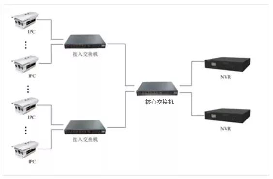 如采用200萬像素IPC,碼流以4Mbps計(jì)算,100臺攝像機(jī)占用帶寬為4M*100=400M,如果是按照10臺攝像機(jī)接入百兆交換機(jī)的話,那么我們需要10臺接入層交換機(jī),那么核心層交換機(jī)需要三層全千兆交換機(jī)。